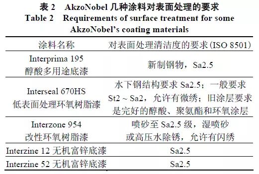 又迈进了一大步。表2 为AkzoNobel 几种涂料对表面处理的要求。