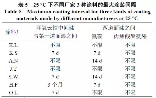 须引起高度注意的是环氧云铁中间漆与第一道氟碳面漆及两道面漆间的涂装间隔。由于各个重防腐涂料生产厂家的产品技术性能不一,上述2 种涂料的涂装间隔也各不相同,见表5。